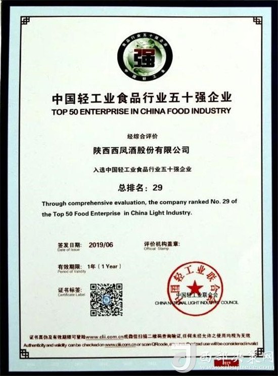 近日,由中國輕工業(yè)聯(lián)合會主辦,主題為“強化科技創(chuàng)新,服務美好生活”的“中國輕工業(yè)百強企業(yè)高峰論壇”在北京召開。會上,中國輕工業(yè)聯(lián)合會公布了2018年度中國輕工業(yè)食品行業(yè)五十強企業(yè),西鳳股份公司憑借良好的發(fā)展業(yè)績、市場口碑、行業(yè)競爭力及日益增強的品牌影響力,被中國輕工業(yè)聯(lián)合會授予“中國輕工業(yè)食品行業(yè)五十強企業(yè)”榮譽稱號,并受到表彰獎勵。