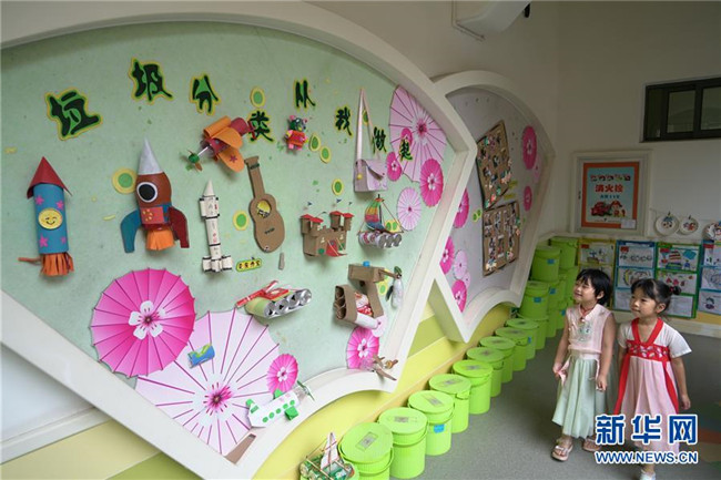 7月4日,德清縣乾元鎮(zhèn)第一幼兒園老師向孩子們講解垃圾分類知識(shí)。新華社記者 林善傳 攝