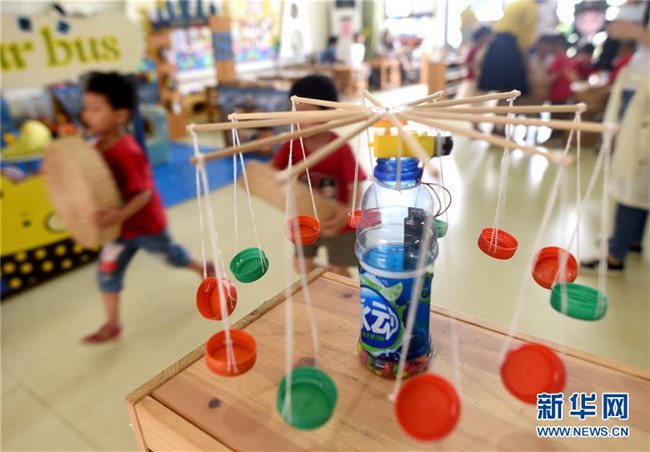 這是7月4日拍攝的德清縣乾元鎮(zhèn)第一幼兒園展示的小朋友通過(guò)廢物回收制作的手工作品。新華社記者 林善傳 攝