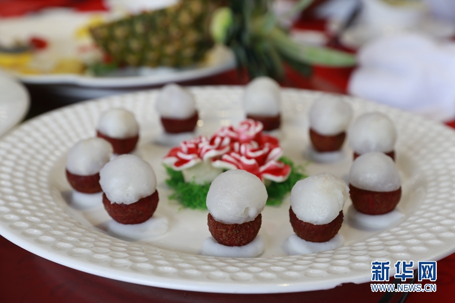 點(diǎn)心師傅用荔枝在創(chuàng)作菜肴。新華網(wǎng) 林曉蕾攝