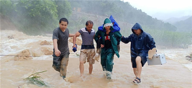 九圩鎮(zhèn)紀(jì)委書記覃國富接到信息后,馬上帶著幾名黨員干部提著急救箱和救援物資出發(fā),并聯(lián)系了鎮(zhèn)衛(wèi)生院的救護(hù)車在未受淹的安全地帶等候,人員則徒步3公里進(jìn)入內(nèi)興屯。