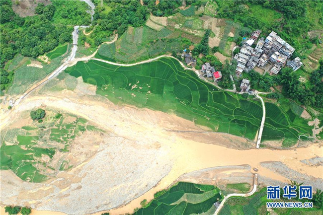 廣西河池市東蘭縣隘洞鎮(zhèn)坡拉村高更屯兩條通屯道路均被洪水沖毀(7月16日無人機拍攝)。