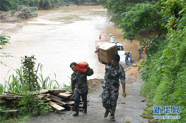 7月16日,廣西河池市東蘭縣隘洞鎮(zhèn)民兵應急分隊隊員將救災物資從船上扛到岸上。