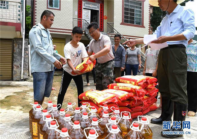 7月16日,廣西河池市東蘭縣隘洞鎮(zhèn)坡拉村高更屯村民在領取救災物資。