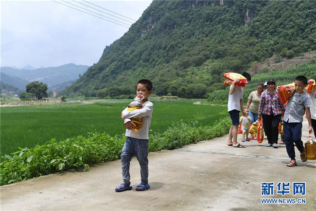 7月16日,廣西河池市東蘭縣隘洞鎮(zhèn)坡拉村高更屯村民拿著剛剛領取的救災物資回家。