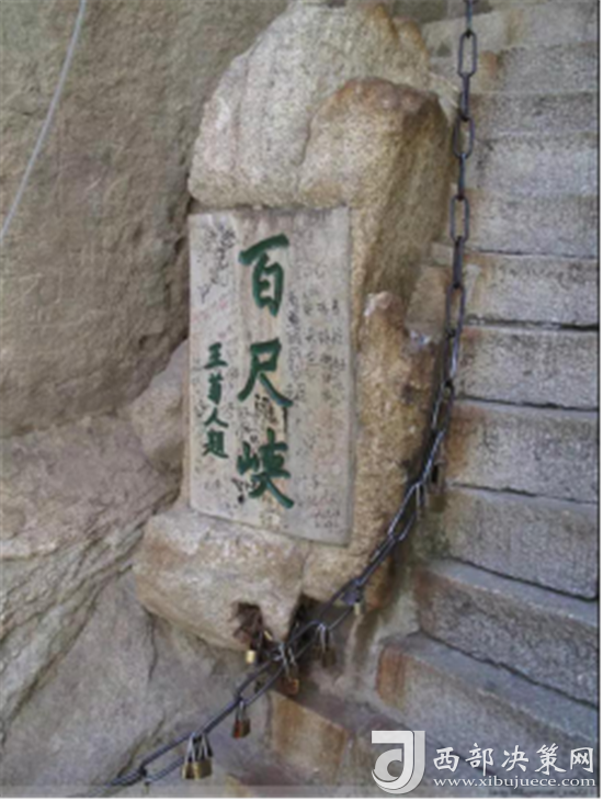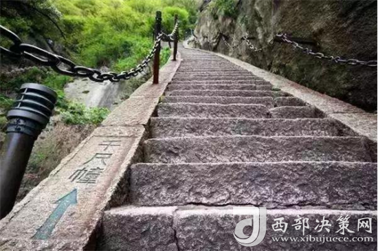 登華山有三道險(xiǎn)關(guān),合稱華山三大險(xiǎn),當(dāng)?shù)亓鱾髦@樣一句民謠:“千尺幢, 百尺峽,老君犁溝往上爬。”