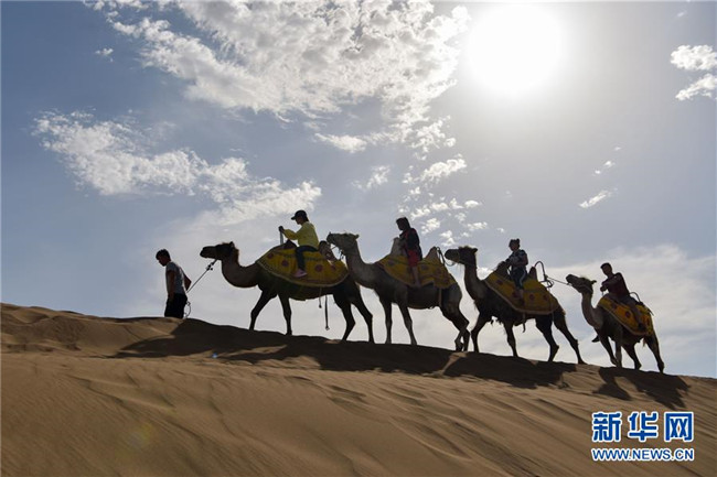 游客在新疆鄯善縣庫木塔格沙漠風(fēng)景區(qū)體驗騎駱駝(7月2日攝)。