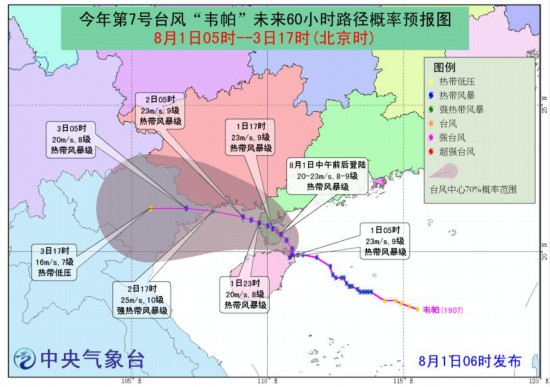 據(jù)中央氣象臺(tái)網(wǎng)站消息,中央氣象臺(tái)8月1日6時(shí)繼續(xù)發(fā)布臺(tái)風(fēng)藍(lán)色預(yù)警,今年第7號(hào)臺(tái)風(fēng)“韋帕”(熱帶風(fēng)暴級(jí))的中心今天凌晨1點(diǎn)50分前后在海南省文昌市沿海登陸。其中,廣東、廣西、福建、海南等地有大到暴雨。