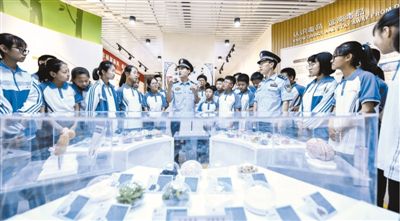 近日,在山東省棗莊市臺兒莊古城中學的禁毒教育基地,民警向?qū)W生介紹新型毒品的種類、特征和危害,提升他們識毒、防毒、拒毒的意識和能力。新華社記者 高啟民攝