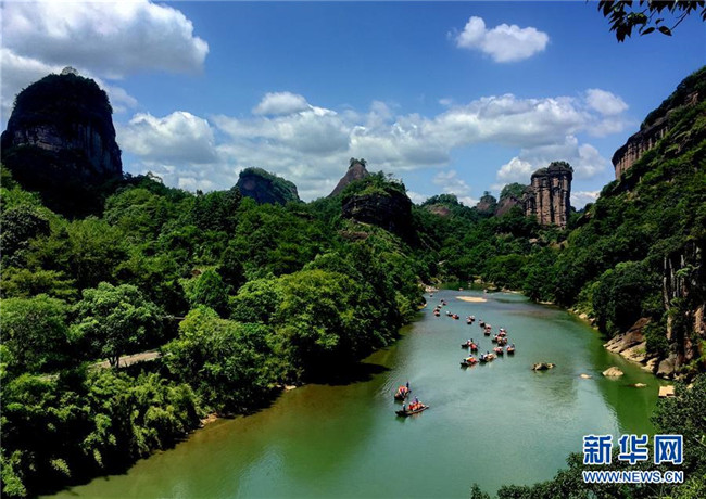 盛夏的福建武夷山,正值暑期旅游高峰,游客乘竹筏沿九曲溪漂流而下,欣賞沿岸美麗風(fēng)光。