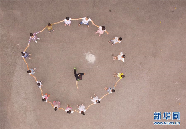 8月5日,參加音樂培訓(xùn)班的小朋友們和老師一起在課間做游戲(無人機(jī)拍攝)。 新華社記者 王全超 攝