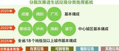 征求意見稿提出將加快建立分類投放、分類收集、分類運(yùn)輸、分類處置的生活垃圾處理系統(tǒng),促進(jìn)城鄉(xiāng)生活垃圾減量化、資源化、無害化,統(tǒng)籌推進(jìn)其他固體廢物處理處置,努力改善城鄉(xiāng)人居環(huán)境。到2020年,成都、德陽、廣元3個國家重點(diǎn)城市基本建成生活垃圾分類處理系統(tǒng),生活垃圾回收利用率達(dá)到35%以上;到2022年,攀枝花、瀘州、綿陽、遂寧4個省級示范城市的中心城區(qū)基本建成生活垃圾分類處理系統(tǒng);到2025年,全省18個地級及以上城市基本建成生活垃圾分類處理系統(tǒng)。