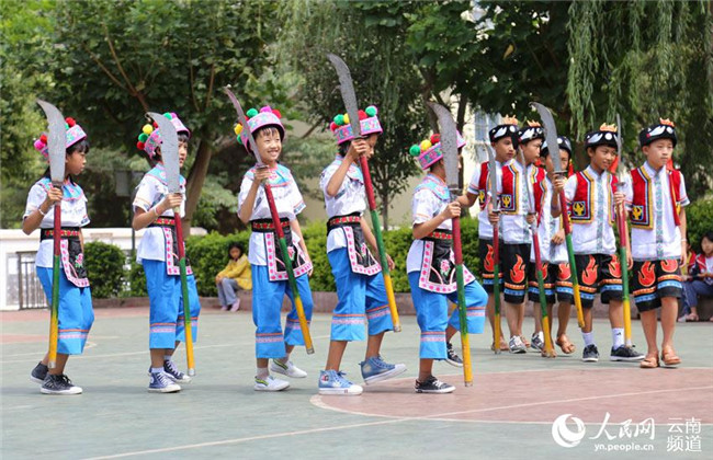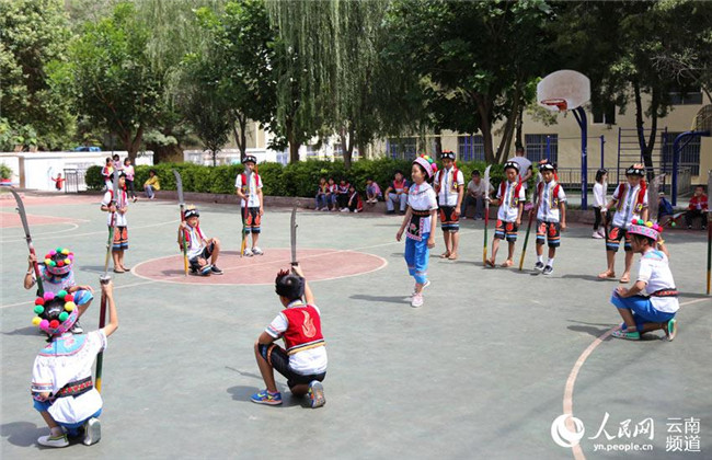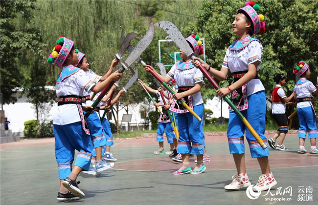 9月2日,云南省漾濞彝族自治縣雞街完小的學(xué)生在課間練習(xí)大刀舞。大刀舞是當(dāng)?shù)匾妥迦罕娫陂L(zhǎng)期的生產(chǎn)生活實(shí)踐中逐漸積累演化形成的一種彝族文化,經(jīng)過(guò)代代藝人們的不斷傳承與完善,于2013年被列為省級(jí)非物質(zhì)文化遺產(chǎn)項(xiàng)目保護(hù)名錄。近年來(lái),漾濞縣不斷加大非物質(zhì)文化遺產(chǎn)保護(hù)力度,組織非遺傳承人走進(jìn)校園,手把手教授孩子們學(xué)習(xí)大刀舞。(李發(fā)興)