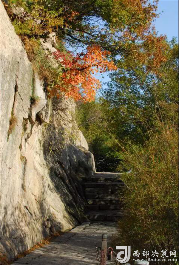 從山腳下的郁郁蔥蔥到山頂上的紅黃相間,華山上的每一個(gè)臺(tái)階都浸染在了紅葉的絢爛中。