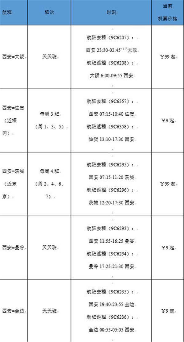 春秋航空西安新開4條國際航線 特價機票低至9元起