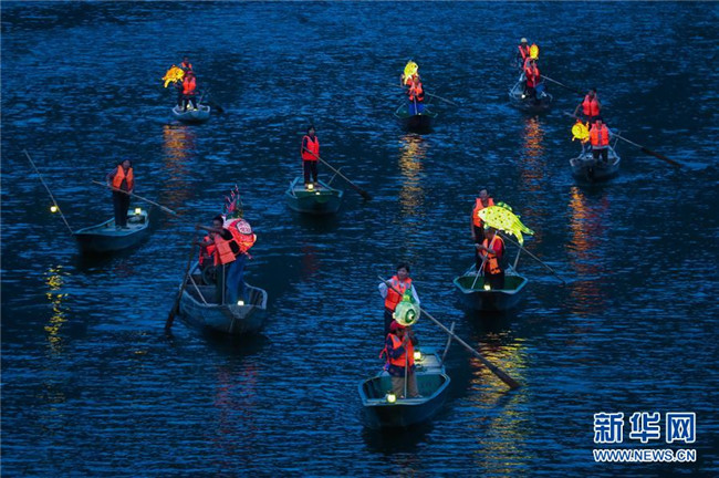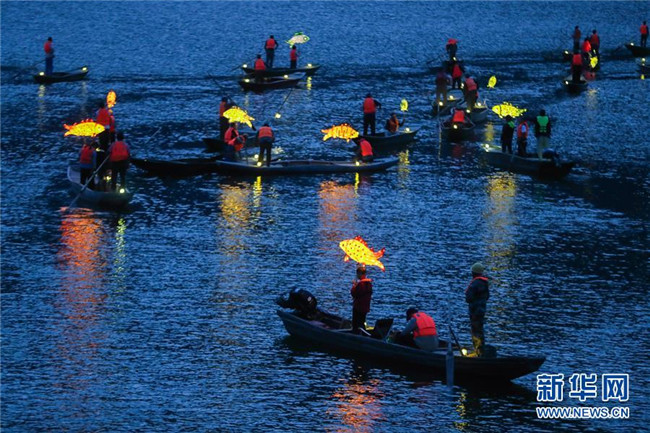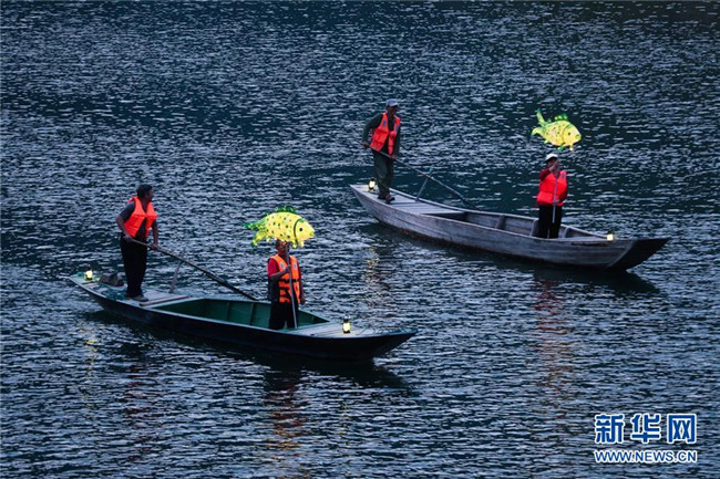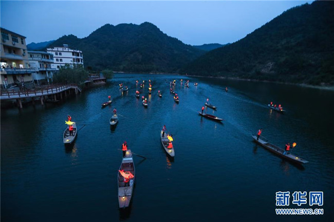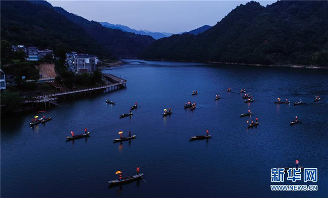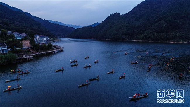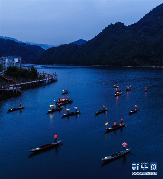 9月25日,在宋村鄉(xiāng)云源港的水面上,漁民劃著漁船,船頭點(diǎn)亮漁燈,構(gòu)成一幅“漁舟唱晚、萬家燈火”的美麗圖景,與沿湖民宿群落交相輝映(無人機(jī)拍攝)。