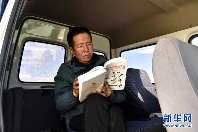 9月25日,青海湖國(guó)家級(jí)自然保護(hù)區(qū)管理局的巡湖觀測(cè)人員王延明在巡湖間隙閱讀中國(guó)鳥(niǎo)類(lèi)野外手冊(cè)。