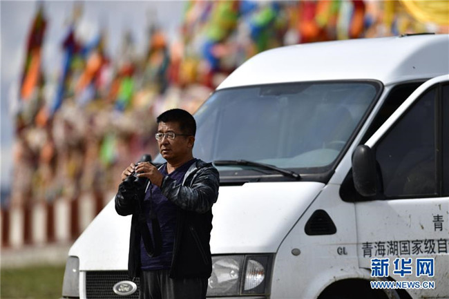 9月23日,青海湖國(guó)家級(jí)自然保護(hù)區(qū)管理局的巡湖觀測(cè)人員楊濤在青海湖畔的尕日拉村觀測(cè)點(diǎn)進(jìn)行觀測(cè)。