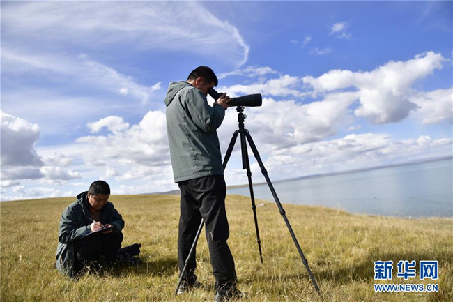 9月23日,青海湖國(guó)家級(jí)自然保護(hù)區(qū)管理局的巡湖觀測(cè)人員在青海湖畔進(jìn)行觀測(cè)。