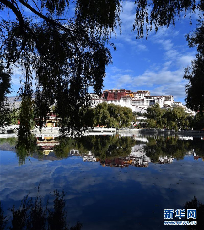 10月16日拍攝的布達(dá)拉宮。 金秋時節(jié),拉薩布達(dá)拉宮在藍(lán)天白云和綠樹碧水的映襯下格外美麗,讓人流連忘返。 新華社記者 覺果 攝