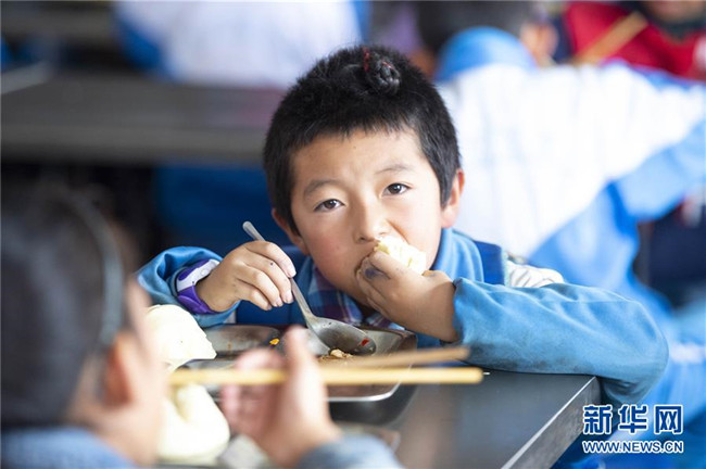 在西吉縣田坪鄉(xiāng)中心小學(xué),學(xué)生在享用免費營養(yǎng)午餐(10月23日攝)。
