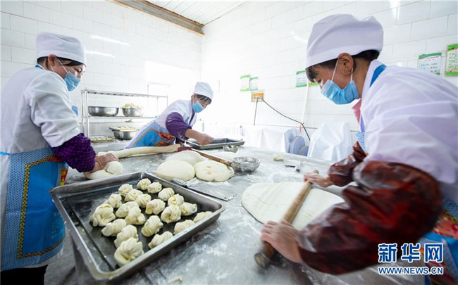 在西吉縣田坪鄉(xiāng)中心小學(xué),食堂的工作人員在制作午餐面點(10月23日攝)。