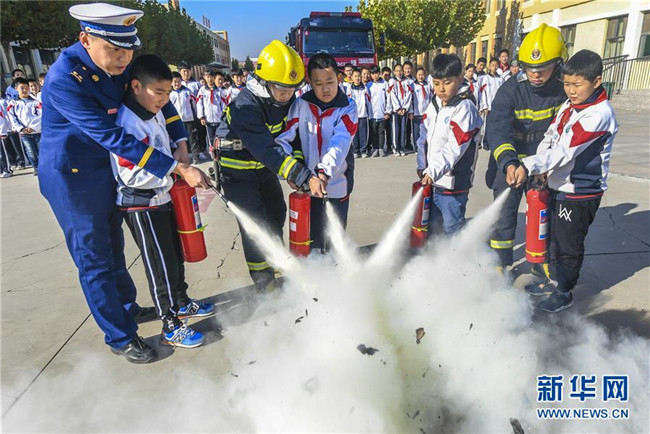 11月8日,消防員在河北省大廠回族自治縣城關小學向學生們展示消防設備的使用方法。新華社記者李曉果攝