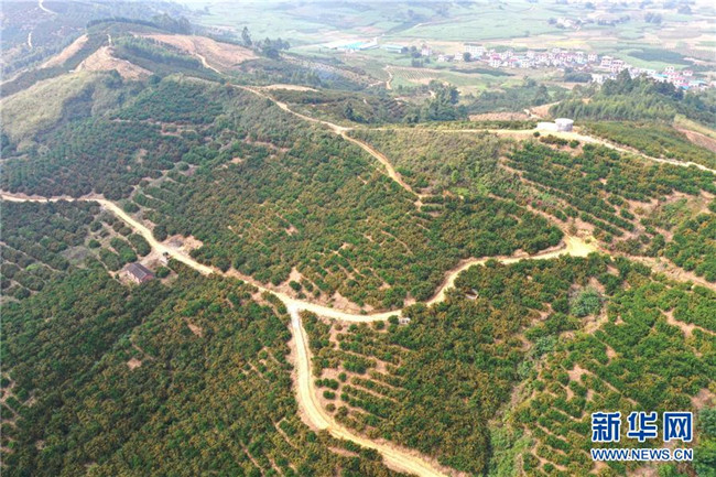 這是鹿寨縣平山鎮(zhèn)大陽村的柑桔種植區(qū)(11月7日無人機拍攝)。