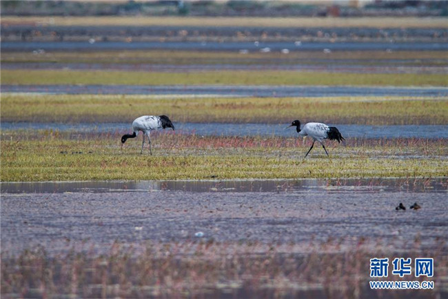 黑頸鶴在納帕海自然保護(hù)區(qū)棲息(11月10日攝)。