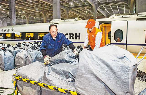 11月12日晚,重慶西站,工作人員正在卸載G8595次列車上的快件。為應(yīng)對“雙11”帶來的巨量物流,重慶鐵路部門利用高鐵動車組、旅客列車行李車等運(yùn)力資源,提供物流服務(wù)。記者龍帆攝