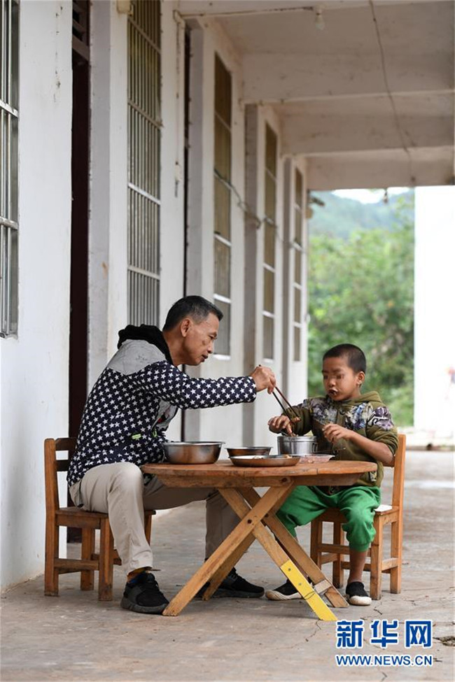 11月19日,在廣西上思縣那琴鄉(xiāng)中心小學(xué)逢通村教學(xué)點(diǎn),梁志雄和一名學(xué)生吃午飯。新華社記者陸波岸攝