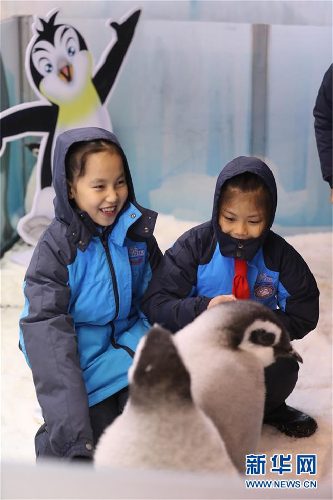 11月25日,小學(xué)生與帝企鵝互動(dòng)。
