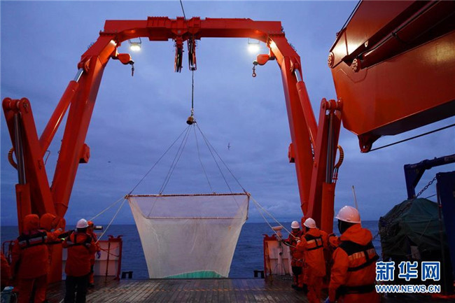 “雪龍2”號12月7日離開南大洋普里茲灣海域向西航行,開始對宇航員海海域展開科考作業(yè)。科考隊員沿著本次宇航員??瓶嫉氖讉€調(diào)查斷面,自北向南做了多個站位的CTD(海水溫鹽深測量儀)采水作業(yè)、浮游生物垂直拖網(wǎng)作業(yè),以及魚類拖網(wǎng)和箱式采樣器等采樣作業(yè)。