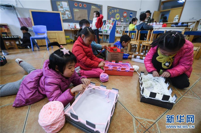 12月11日,小朋友們在老師的帶領(lǐng)下用紙盒制作的工具編織愛心圍巾。新華社記者 徐昱 攝