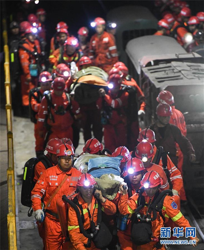 12月18日,救援人員轉(zhuǎn)運(yùn)安全升井的被困人員。新華社記者 薛玉斌 攝