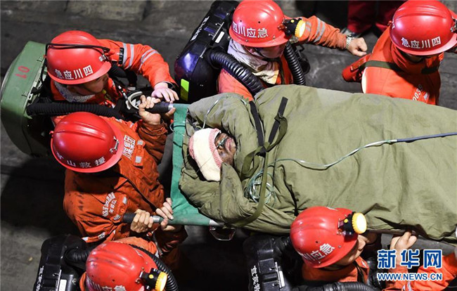 12月18日,救援人員轉(zhuǎn)運(yùn)安全升井的被困人員。 當(dāng)日7時(shí)56分,經(jīng)過(guò)80多個(gè)小時(shí)的緊張救援,發(fā)生透水事故的川煤集團(tuán)杉木樹煤礦13名被困人員全部安全升井。 新華社記者 薛玉斌 攝