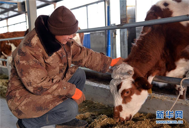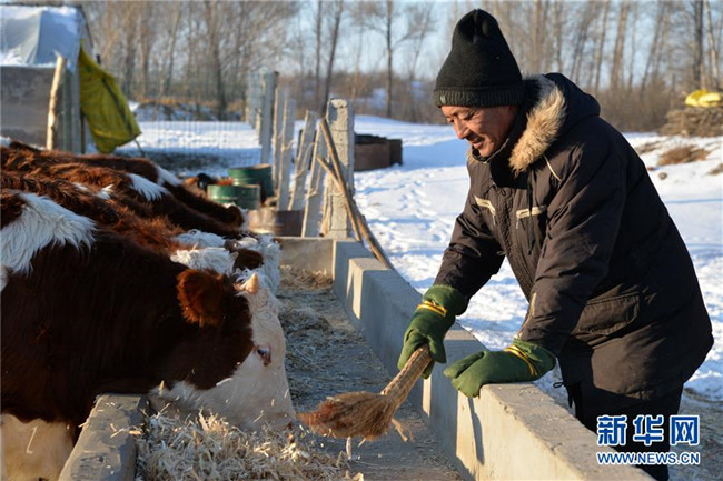 12月19日,科左后旗巴嘎塔拉蘇木劉金山養(yǎng)牛合作社的管理員劉德全在查看黃牛長勢。新華社記者徐欽攝