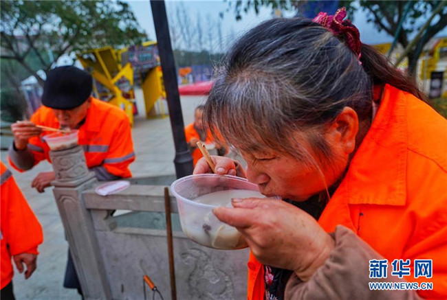12月22日,在成都市雙流區(qū)黃甲街道,環(huán)衛(wèi)工人喝上暖洋洋的羊肉湯。新華社記者江宏景攝
