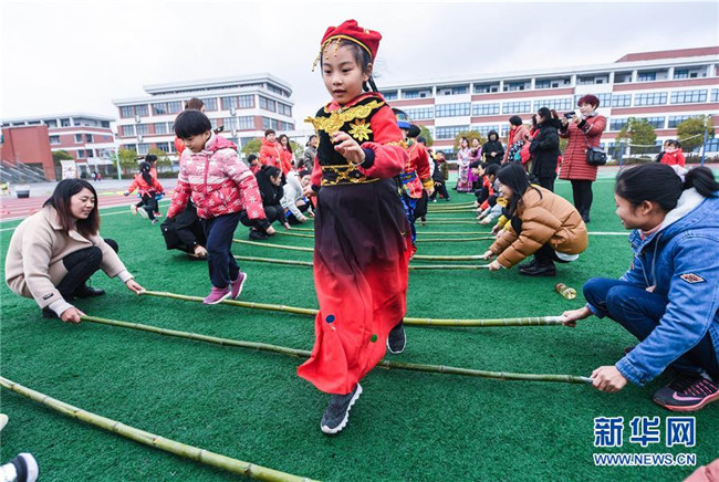 12月26日,身著少數(shù)民族服裝的孩子與同學(xué)們一起體驗(yàn)竹竿舞趣味活動(dòng)。當(dāng)日,浙江省長(zhǎng)興縣李家巷鎮(zhèn)中心幼兒園舉辦“炫彩民族風(fēng)歡樂來運(yùn)動(dòng)”為主題的趣味民族游戲活動(dòng)。該幼兒園有一些孩子來自壯族、苗族、布依族等少數(shù)民族。幼兒園旨在通過這種活動(dòng),讓孩子們和家長(zhǎng)共同體驗(yàn)竹竿舞、篝火舞、擲糠包等少數(shù)民族特色游戲,了解少數(shù)民族特色文化。新華社記者徐昱攝