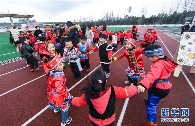12月26日,身著少數(shù)民族服裝的孩子與同學(xué)們一起參加篝火舞活動(dòng)。當(dāng)日,浙江省長(zhǎng)興縣李家巷鎮(zhèn)中心幼兒園舉辦“炫彩民族風(fēng)歡樂來運(yùn)動(dòng)”為主題的趣味民族游戲活動(dòng)。該幼兒園有一些孩子來自壯族、苗族、布依族等少數(shù)民族。幼兒園旨在通過這種活動(dòng),讓孩子們和家長(zhǎng)共同體驗(yàn)竹竿舞、篝火舞、擲糠包等少數(shù)民族特色游戲,了解少數(shù)民族特色文化。新華社記者徐昱攝