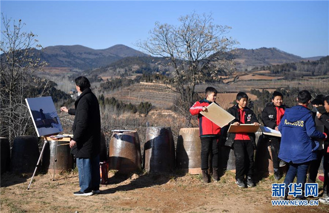 洛寧縣羅嶺鄉(xiāng)初級中學學生在洛寧縣前河村進行繪畫創(chuàng)作(12月29日攝)。新華社記者 李嘉南 攝