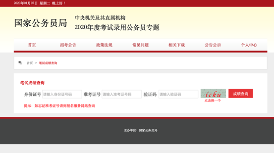 今晚,中央機(jī)關(guān)及其直屬機(jī)構(gòu)2020年度公務(wù)員招考公共科目筆試成績(jī)正式公布??忌稍谥醒霗C(jī)關(guān)及其直屬機(jī)構(gòu)2020年度考試錄用公務(wù)員專題網(wǎng)站查詢筆試成績(jī)和最低合格分?jǐn)?shù)線。