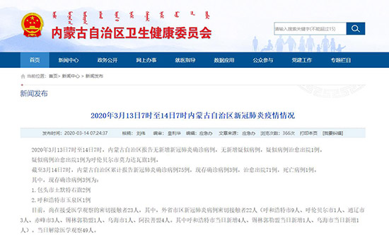 截至3月14日7時,內(nèi)蒙古自治區(qū)累計報告新冠肺炎確診病例75例,現(xiàn)存確診病例3例,治愈出院71例,死亡病例1例。