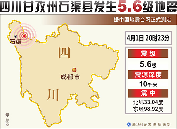 據(jù)中國(guó)地震臺(tái)網(wǎng)正式測(cè)定,1日20時(shí)23分在四川甘孜州石渠縣發(fā)生5.6級(jí)地震,震源深度10千米。