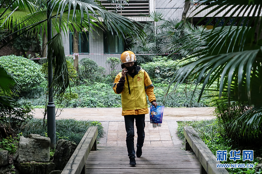 到達(dá)送餐的小區(qū)后,王淞迅速跟對方取得聯(lián)系,上門進(jìn)行配送。據(jù)沙坪壩區(qū)委政法委相關(guān)負(fù)責(zé)人介紹,通過快遞和外賣配送業(yè)務(wù)來發(fā)送宣傳制品,是為了讓宣傳教育活動由人員聚集到分散入戶,變集中宣傳為流動宣傳,同時不降低疫情期間群眾參與度。新華網(wǎng) 韓夢霖 攝