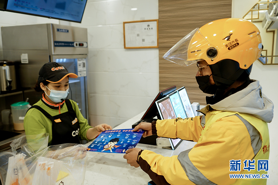 王淞在取餐前,先將一份宣傳海報交給了配餐的商家。這是他今天的第9個訂單,王淞覺得參加這樣的活動十分有意義,讓自己在送餐掙錢之外又多了一份社會責(zé)任感。新華網(wǎng) 韓夢霖 攝