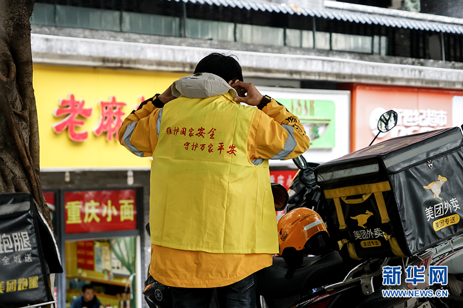 來到取餐的商家,王淞整理了一下印有國家安全宣傳標(biāo)語的背心。當(dāng)天,重慶市沙坪壩區(qū)有200多名外賣騎手身著這款背心穿梭在大街小巷,化身國家安全宣傳使者,把國家安全宣傳品送到居民群眾手里,讓維護(hù)國家安全的宣傳標(biāo)語成為一道流動而醒目的風(fēng)景線。新華網(wǎng) 韓夢霖 攝
