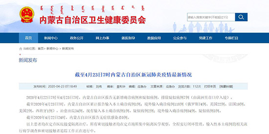 人民網(wǎng)呼和浩特4月23日電 (陳立庚)4月23日,記者從內(nèi)蒙古自治區(qū)衛(wèi)生健康委員會(huì)獲悉,2020年4月22日7時(shí)至4月23日7時(shí),內(nèi)蒙古自治區(qū)報(bào)告無新增確診病例和疑似病例,排除疑似病例7例(由滿洲里市口岸入境)。