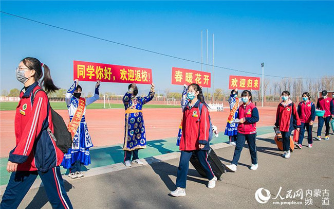 設(shè)置測(cè)溫消毒通道、實(shí)行錯(cuò)峰分餐制、增設(shè)臨時(shí)隔點(diǎn)……4月26日,內(nèi)蒙古呼和浩特市玉泉區(qū)教育局多措并舉織密疫情防控安全網(wǎng)的前提下,高一、高二年級(jí),初一、初二年級(jí)有序返校復(fù)學(xué)。這是該區(qū)第二批次學(xué)校開學(xué),高三、初三年級(jí)已于3月30日復(fù)課。(丁根厚 攝)