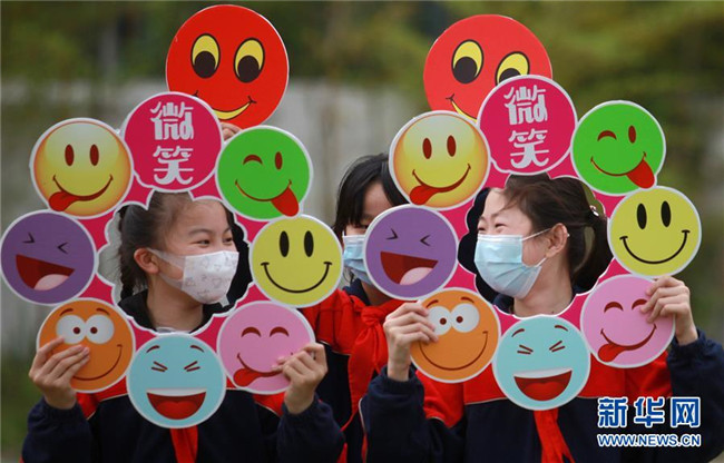 5月8日,在湖北省宜昌市秭歸縣第一中學,老師在上網課前手拿自制的笑臉卡與學生互動。 當日是世界微笑日。 新華社發(fā)(向紅梅 攝)